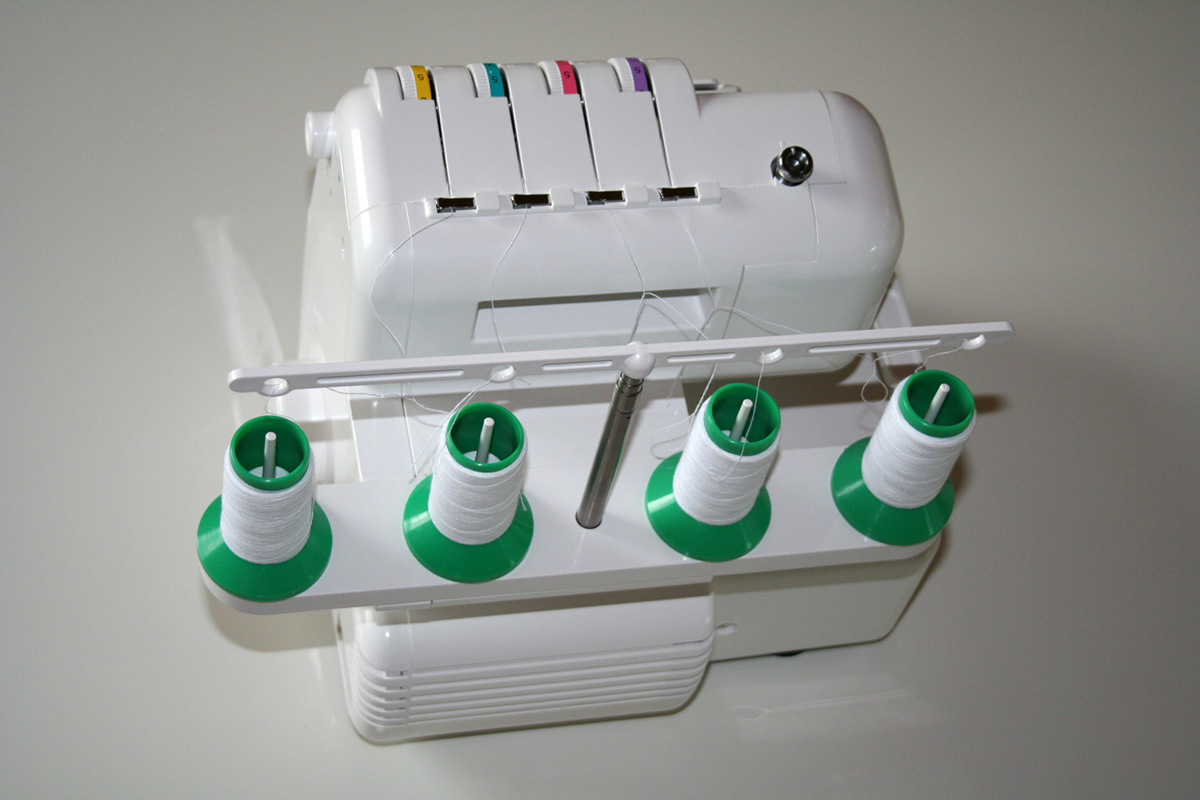 Im Lieferumfang enthalten sind die 5 Zusatzfüße für einen Elastik-, Blind-, Kräusel-, Pailetten- und Biesenstich. Außer den Garnabziehscheiben, Auffangbehälter, Garnnetzen, Kunststoffbox usw., ist auch eine Staubschutzhaube im Zubehör enthalten. Sie ist leicht einzufädeln und hat eine Einfädelhilfe für den Untergreifer.