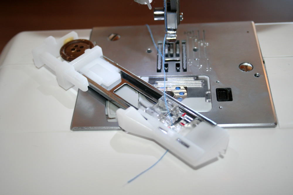 Vier verschiedene Programme bietet die W6 N 3300 exklusive an, um Knopflöcher zu nähen. Es muss dafür der spezielle Nähfuß eingesetzt werden. Der ist aber perfekt: In ihn wird der Knopf eingelegt. Dadurch näht die Computernähmaschine das Knopfloch in der richtigen Größe vollautomatisch. Zum Schluss muss nur noch mit dem beiliegenden Nahttrenner der Stoff geschnitten werden. Das Annähen von Knöpfen funktioniert ebenfalls sehr einfach – hierbei würde ich aber einen Blick in die Anleitung empfehlen. Entsprechend habe ich einige Fotos für euch: