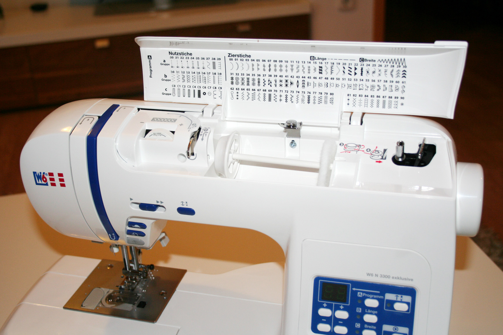 Die W6 N 3300 exklusive ist von einem deutschen Hersteller (W6 Wertarbeit) und wurde in Taiwan produziert. Im Vergleich zum Vorgänger ist sie designtechnisch verbessert worden. Die Verarbeitung ist sehr gut, da können sich andere Hersteller noch eine Scheibe abschneiden. Sie ist nicht leicht, weil sie innen aus Vollmetall ist: Für mich ist dies eher von Vorteil, weil sie dadurch sehr stabil auf dem Tisch steht und bei voller Geschwindigkeit nicht hüpft. Nichts klappert oder wackelt, der Nähfuß wirkt hochwertig und vom Design her sieht sie auch klasse aus.
