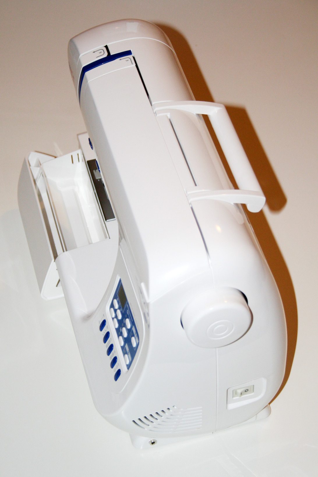 Üppig ist der Lieferumfang. 5 verschiedene Nähfüße, Ersatznadeln, Kunststoffspulen, ein Trennmesser, ein Quiltlinieal, ein Reinigungspinsel, Schraubendreher und eine Abdeckung sind dabei. Dabei ist auch ein Fußanlasser, der Marke Electronic (kennt man z.B. von Lifetec Nähmaschinen). Ich habe einige Bilder beim Auspacken gemacht.