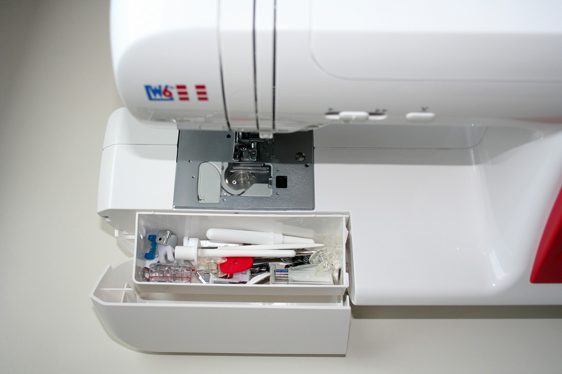 Bereits nach dem Auspacken fällt auf, dass hier wieder gut verarbeitet wurde – Nichts klappert oder klemmt. Vom Design her hat W6 einen Schritt nach vorne gemacht. Statt wie bei der W6 N 3300 Exklusive auf blaue Akzente setzt der Hersteller hier auf einen roten Rahmen rund um das Touchscreen-Display. Die W6 N 5000 verfügt über einen Freiarm. Dazu muss der Anschiebetisch entfernt werden. Beim Anbringen rastet der Anschiebetisch hervorragend wieder ein.