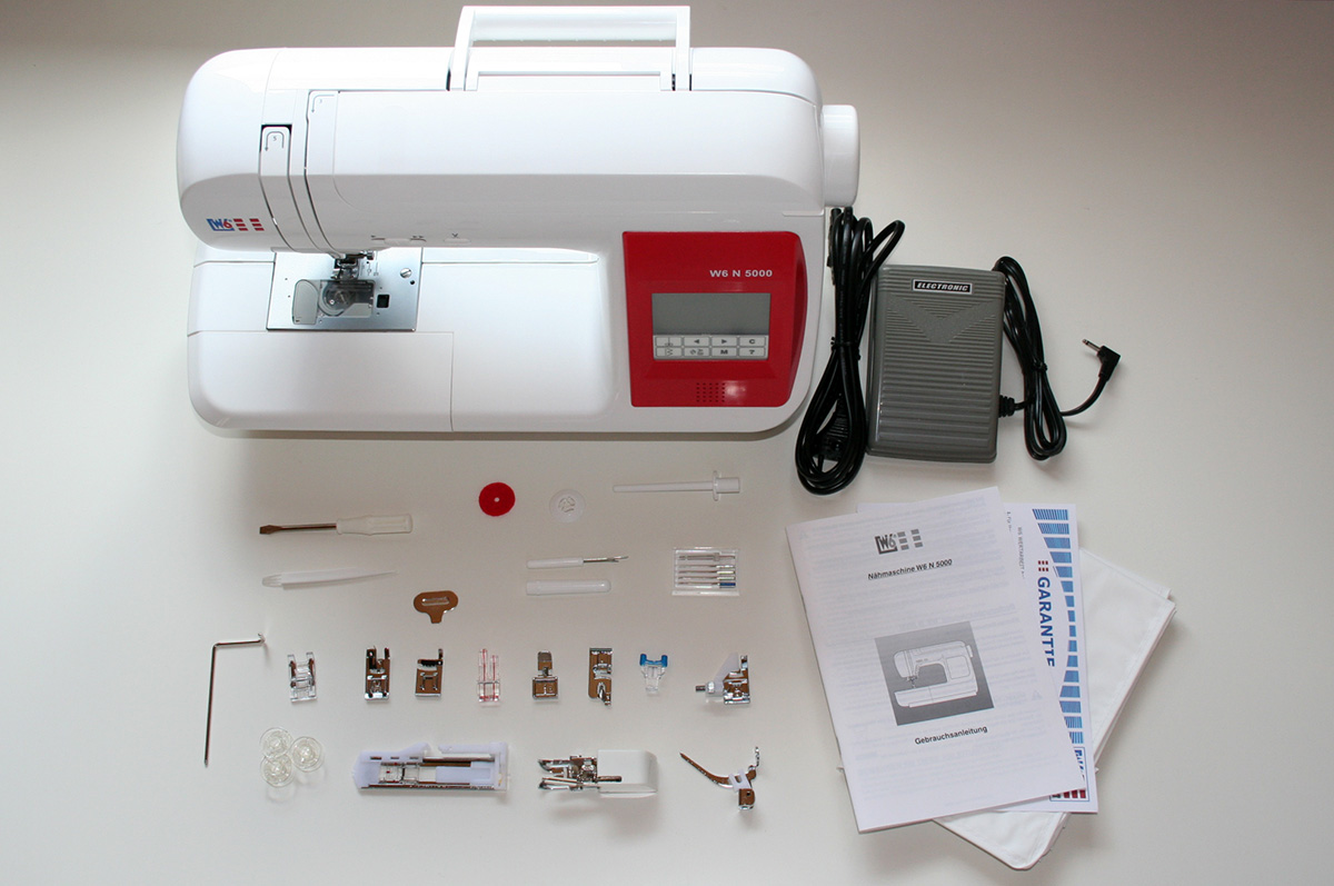 Im Vergleich zur W6 N 3300 Exklusive hat die W6 N 5000 einen größeren Lieferumfang. Angesichts des kleinen Preises kaum zu glauben. Enthalten sind 12 verschiedene Nähfüße (Overlockfuß, Blindstichfuß, Reißverschlussfuß, Applikationsfuß, Standard-/Zickzackfuß, Knopfannähfuß, Geradstich/Quiltfuß, Rollsaumfuß, Kordelaufnähfuß, Stick- und Stopffuß). Sogar einen Obertransportfuß hat W6 Wertarbeit in einer separaten Verpackung beigelegt.