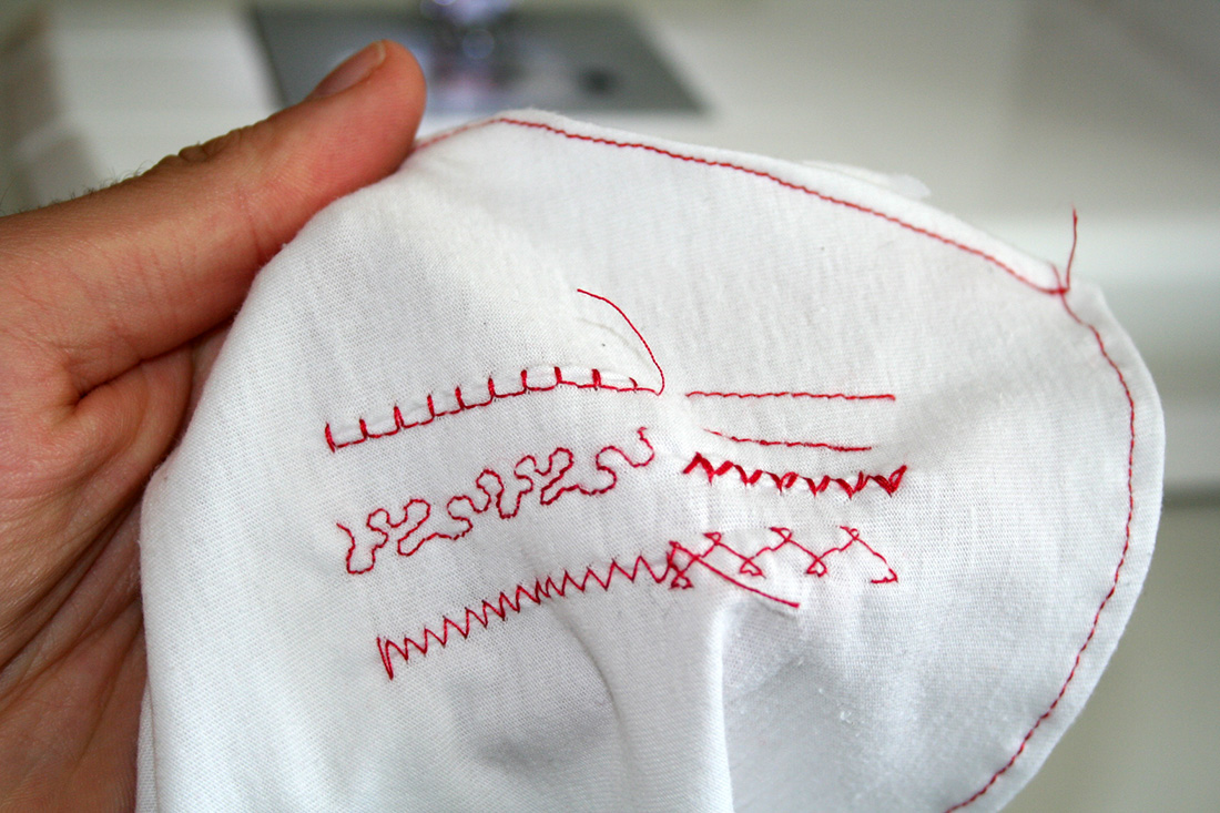Probleme gab es allerdings beim Nähen des oben abgebildeten Schnittmusters mit maximaler Geschwindigkeit mit dem Oberfaden. Der Faden riss mehrmals. Nachdem ich die Abdeckung für die LED-Leuchte geöffnet hatte, kam die Ursache zum Vorschein: im Inneren der Nähmaschine hat sich der Faden um einen Metallhaken gewickelt. Nachdem ich den aufgewickelten Faden entfernt habe, ließ sich der Fehler nicht reproduzieren – also alles gut!
